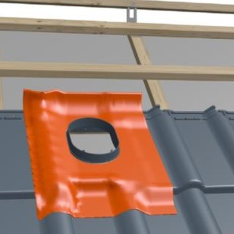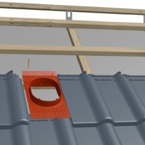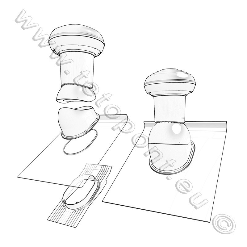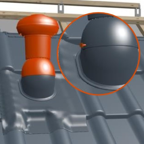 4. Az öntapadós gallér oldalainak és aljának megfelelő leragasztását követően, a tartótól kiindulva, kifelé haladó irányba (oldalra és lefelé) gondosan ragasszuk az öntapadós gallért a tetőszerkezethez. Az éleket pl. a tetőfedésnél használatos préshengerrel kell lenyomni. A gallér tetejét felfelé kell hajlítani, és kerámia tetőcserepek esetében a felesleget (a részt ami felső zárócseréppel találkozik) le kell vágni. Az univerzális strangszellőző körül elhelyezkedő összes cserepet viharkapoccsal szükséges rögzíteni!