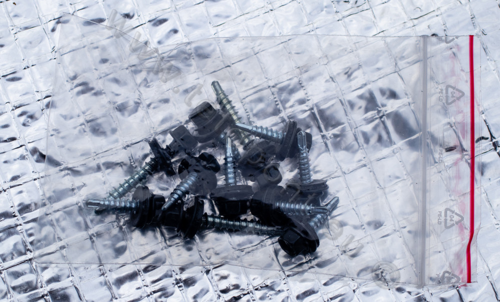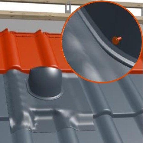 5. Az alaplap felső részét (könyökelem) a gallérhoz kell nyomni és össze kell csavarozni a karimával, a négy rövidebb farmer csavar segítségével. Ezután fektesse le a felső sor cserepet. Fontos – a korábban felhajtott UNI öntapadós gallérnak szorosan kell tapadnia a cserép aljához.